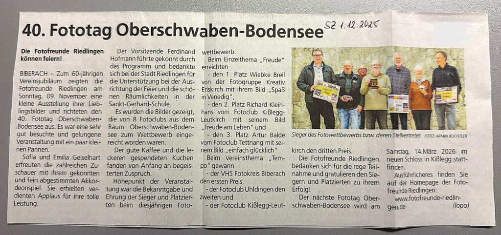 Erneut gelingt dem Fotoclub Kisslegg-Leutkirch ein gutes Ergebnis beim „Fototag Oberschwaben Bodensee“, in diesem Jahr ausgerichtet von den Fotofreunden Riedlingen e.V..